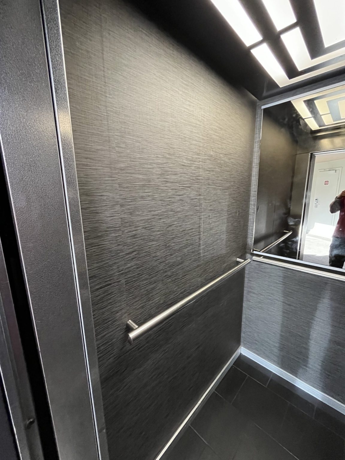 À l’intérieur des ascenseurs, l’effet tissu crée une ambiance chaleureuse et luxueuse, offrant aux clients une expérience unique dès le premier instant. L’extérieur, quant à lui, se pare d’un adhésif effet bois, apportant une élégance naturelle à la structure.